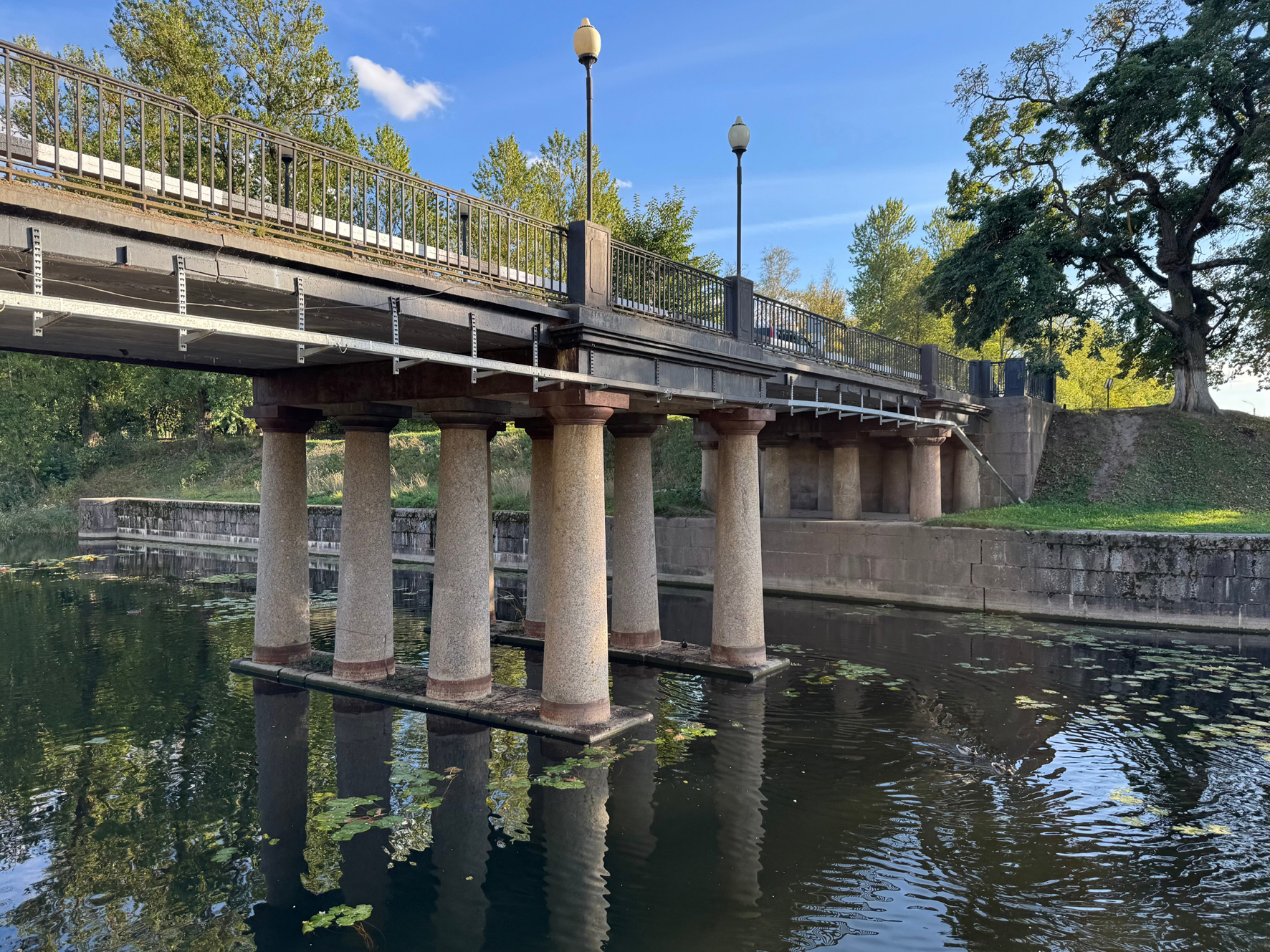 В 1826 году в Шлиссельбурге были сооружены новые шлюзы, а вместе ними — сохранившийся до наших дней разводной двухпролетный мост. Переправа была наведена по проекту инженера Петра Базена и открыта в 1832-м, к 100-летию Староладожского канала. Мост длиной 47 и ширина 6,4 метра предназначался для прохода пешеходов и проезда конных повозок. Его разводили, чтобы пропускать шедшие по каналу суда. Опорами переправы являются колонны из розового гранита. С моста открывается живописный вид на старую шлюзовую систему, устье Невы и Соборную площадь. А на перилах у северного подножия переправы можно увидеть небольшой арт-объект. Он был установлен в 2017-м в честь 315-й годовщины основания города и посвящен мотыльку-ручейнику, считающемуся эндемиком Шлиссельбурга.