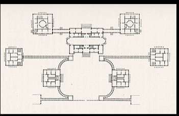 Этот центральный корпус становится главным композиционным элементом, вокруг которого располагаются в гармоничном равновесии остальные элементы ансамбля, а его поперечная ось служит главной осью, относительно которой симметрично располагаются строения будущего дворцового ансамбля.