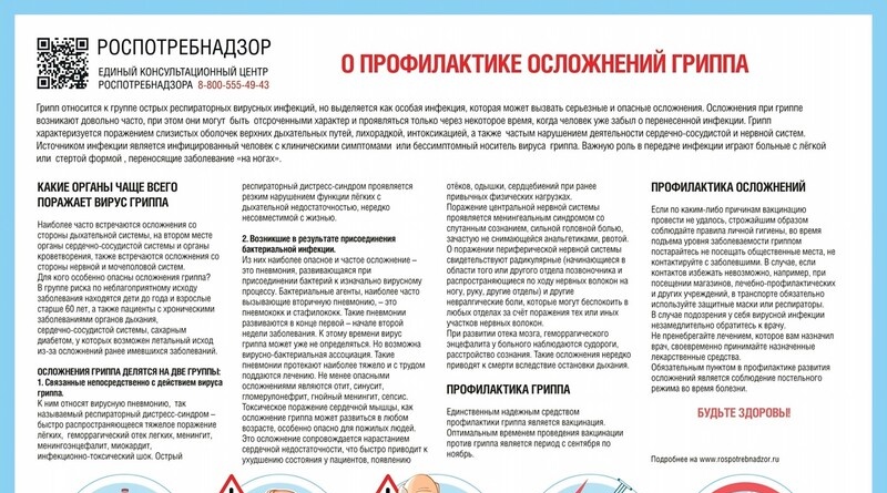 Роспотребнадзор напоминает, что в Российской Федерации продолжается кампания по бесплатной вакцинации от гриппа. Это заболевание чревато серьезными осложнениями, например, пневмонией и синуситом, а также может привести к усугублению хронических патологий, особенно сердечно-сосудистой системы.