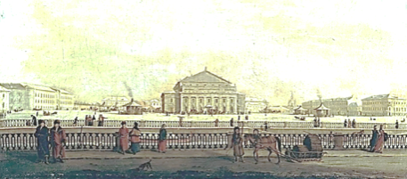 Вид Большого театра в Петербурге кисти И-Г Майера. Между 1796 и 1803 годами он исполнил живописную серию видов Санкт-Петербурга, посвященную столетию города. Девять произведений этой серии хранятся в Государственном Русском музее, в том числе и эта картина. Виртуальный Русский музей Экспонирование Михайловский замок, Зал 237. Кавалерская Марии Федоровны Пост. в 1931 г. из Детскосельского Александровского дворца-музея