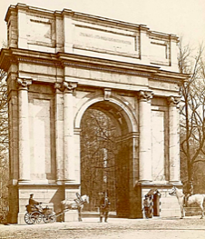 В 1773 – 1778 годах по проекту Ринальди на южной границе Екатерининского парка при выезде в Гатчину вместо временной деревянной триумфальной арки под руководством архитектора Ильи Неелова были возведены каменные Орловские или, как иногда их называют, Гатчинские ворота. Триумфальные ворота стали прижизненным памятником графу Григорию Григорьевичу Орлову в знак благодарности за принятые им меры для прекращения эпидемии чумы, охватившей Москву в 1771 году. Они представляют собой сложенную из кирпича и облицованную мрамором разных цветов однопролетную монументальную арку в форме квадрата высотой около 15 метров.