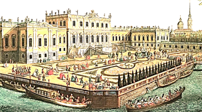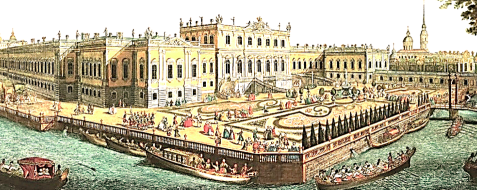 Летний дворец Елизаветы Петровны. Раскрашенная гравюра Алексея Грекова по рисунку Михаила Махаева