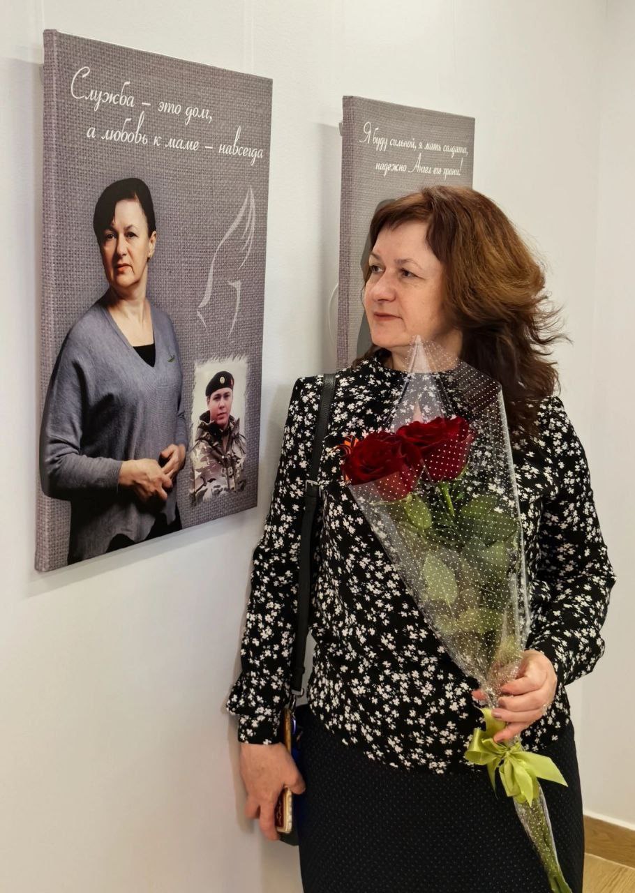 Лилия Бычкова рядом со своим и Сашиным портретом на фотовыставке «Мать защитника Отечества»