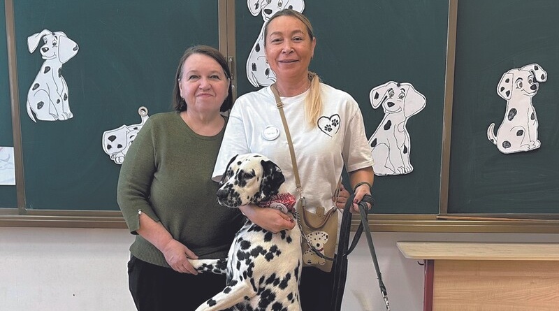 На доске в учебном классе — рисунки далматинов. Дети из Малышкиной школы (группы подготовки к 1 классу) заранее готовились к приёму четвероногих гостей. А собаки, которые приехали к ребятам, — дружелюбные далматины Кира и Лёля и спаниель-трюкач Гуччи — без сомнения, украсят любой семейный портрет.