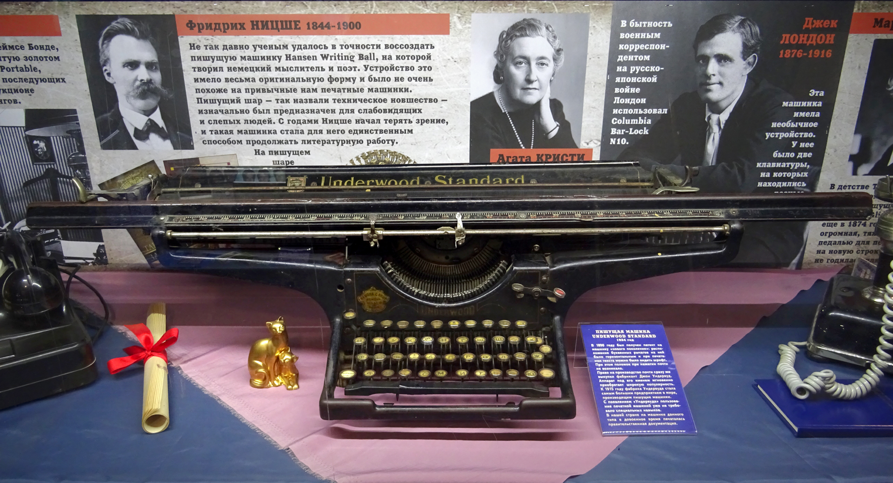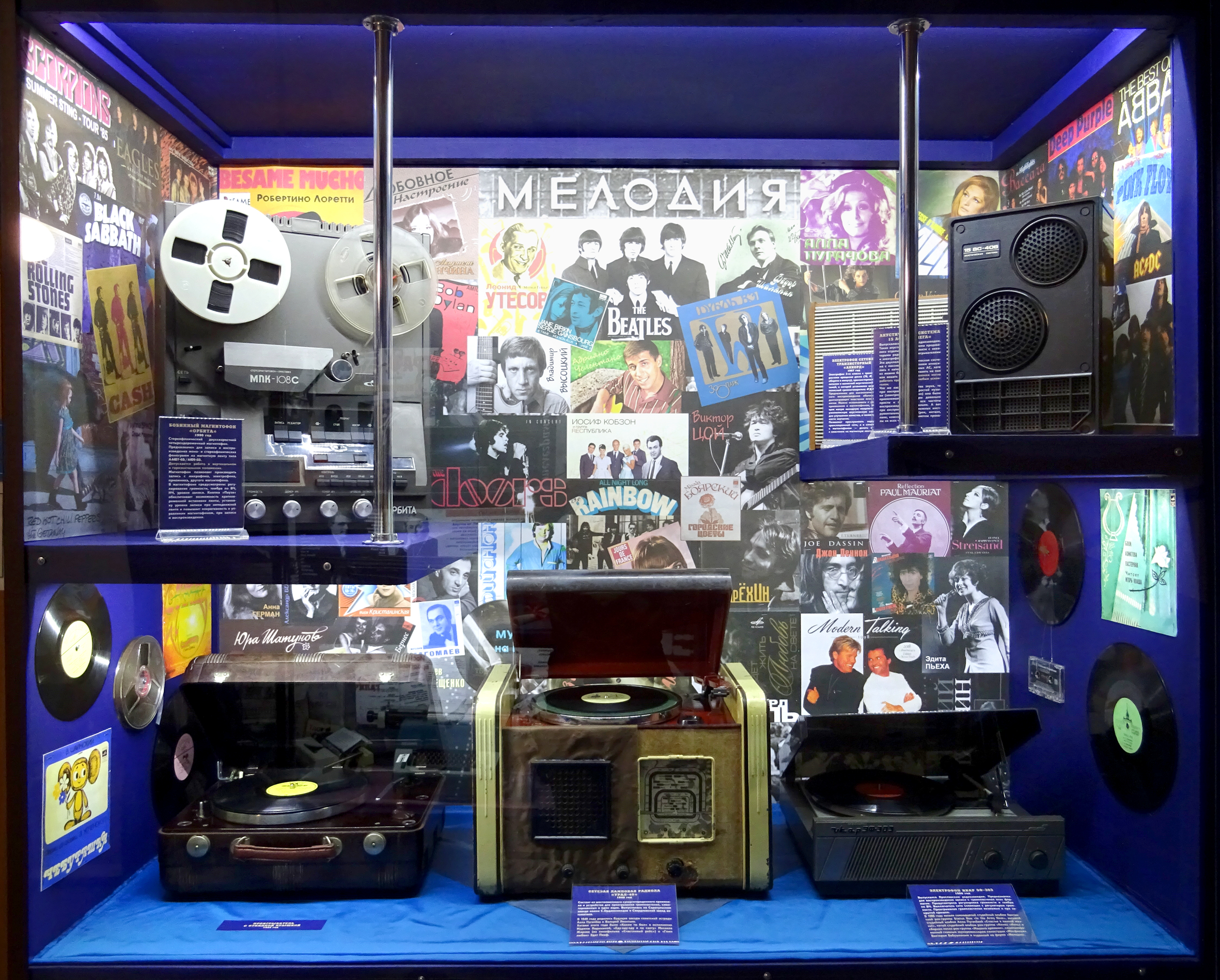 Нескольким экспонатам музея — больше ста лет! Здесь можно узнать тайну картины «Утро в сосновом лесу», написанной в 1889 году; послушать, как тикают часы с кукушкой, созданные в разгар Великой Отечественной войны, в 1943-м; «посмотреть» первую видеотрансляцию футбольного матча по телевизору 1949 года; увидеть предшественницу телефонной трубки, с помощью которой повстанцы в фильме «Матрица» возвращались в реальный мир; позвонить в прошлое по телефону 1965 года выпуска и в зависимости от набранного номера, закружиться в танго под магнолиями с А.Вертинским в 1931-м в бананово-лимонном Сингапуре; присоединиться к бродячим музыкантам, отправившимся из Бремена в 1969-м, чтобы нести людям смех и радость; вместе с Кларой Румянцевой пожать лапку нежного зверька, приехавшего в ящике с апельсинами в 1971-м и получившего имя Чебурашка. или встать плечом к плечу с Виктором Цоем в 1987-м, отряхнуть с ног звездную пыль и последовать за своей удачей... А поскольку пушистые домашние питомцы являются невольными свидетелями технического прогресса, а порой и своеобразными пользователями человеческих изобретений, то по выставке посетителей «ведут» именно они.