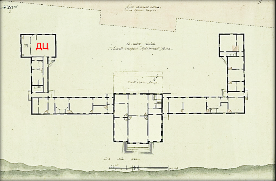 План старого деревянного дворца в Пелле. РГИА Ф.485 Оп.3 Д.177 Литерой ДЦ обозначена домовая церковь во имя Святого Иоанна Милостивого