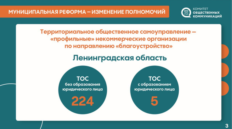 Отметим, что в Ленинградской области в 2025 году действуют 224 ТОСа без образования юридического лица и пять ТОСов в статусе юридического лица.