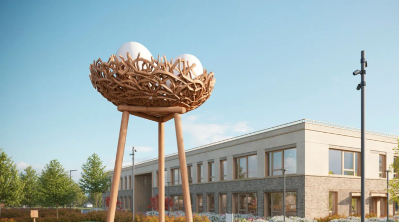 Архитектурная концепция детского сада основана на образе «родительского гнезда» — тёплого и безопасного пространства, где ребёнок делает первые шаги в большой мир. Эта идея отражена в золотистых фасадах, ассоциирующихся с соломой и скорлупой, в решениях благоустройства и интерьеров.