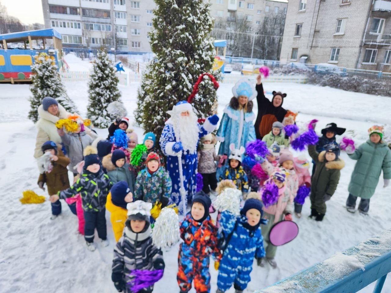 Ребята весело и задорно наряжали ёлку, зажигательно танцевали с султанчиками, пели новогодние песни водили дружный хоровод. К детям пришли гости из сказки. Дед Мороз  — с играми и загадками; Снеговик‑почтовик  — покорил веселыми танцами, Снегурочка пела, а Медведь веселил всех шуткми . Дети смеялись, танцевали и заряжались новогодним настроением! Пусть волшебство останется с нами на весь год!