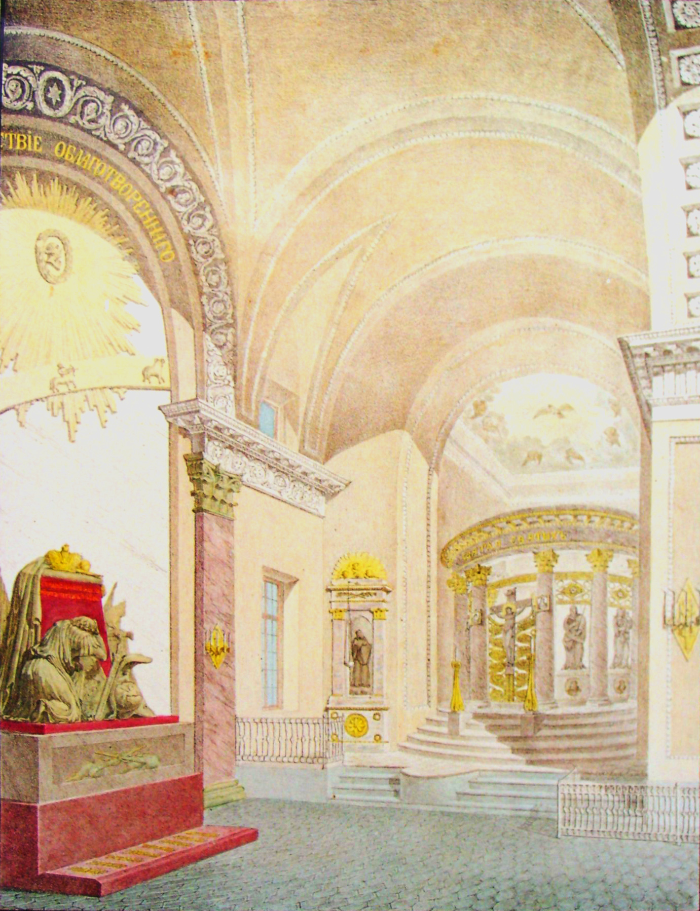 После кончины императора граф увековечил память о нем. Во дворце появились изготовленные в Париже мастером Пьером-Виктором Ледюром часы из золоченой бронзы с музыкой. Фигура на часах изображала самого Аракчеева в образе воина, склонившегося перед бюстом Александра I. Ежедневно в 22:40 (время смерти императора) часы трижды играли вечную память. В комнатах, где останавливался Александр I, все его вещи сохранялись в полной неприкосновенности. А между собором и дворцом был установлен памятник работы скульптора Самуила Гальберга. Три фигуры на гранитном пьедестале: Вера, Надежда и Милосердие — держали бюст императора. Одна из них, Милосердие, одновременно короновала его сияющим венком. У подножия памятника располагались воин со щитом с гербом Аракчеева и освобожденная от Наполеона Европа. Спереди на пьедестале было выбито: «Государю-благодетелю по кончине Его».