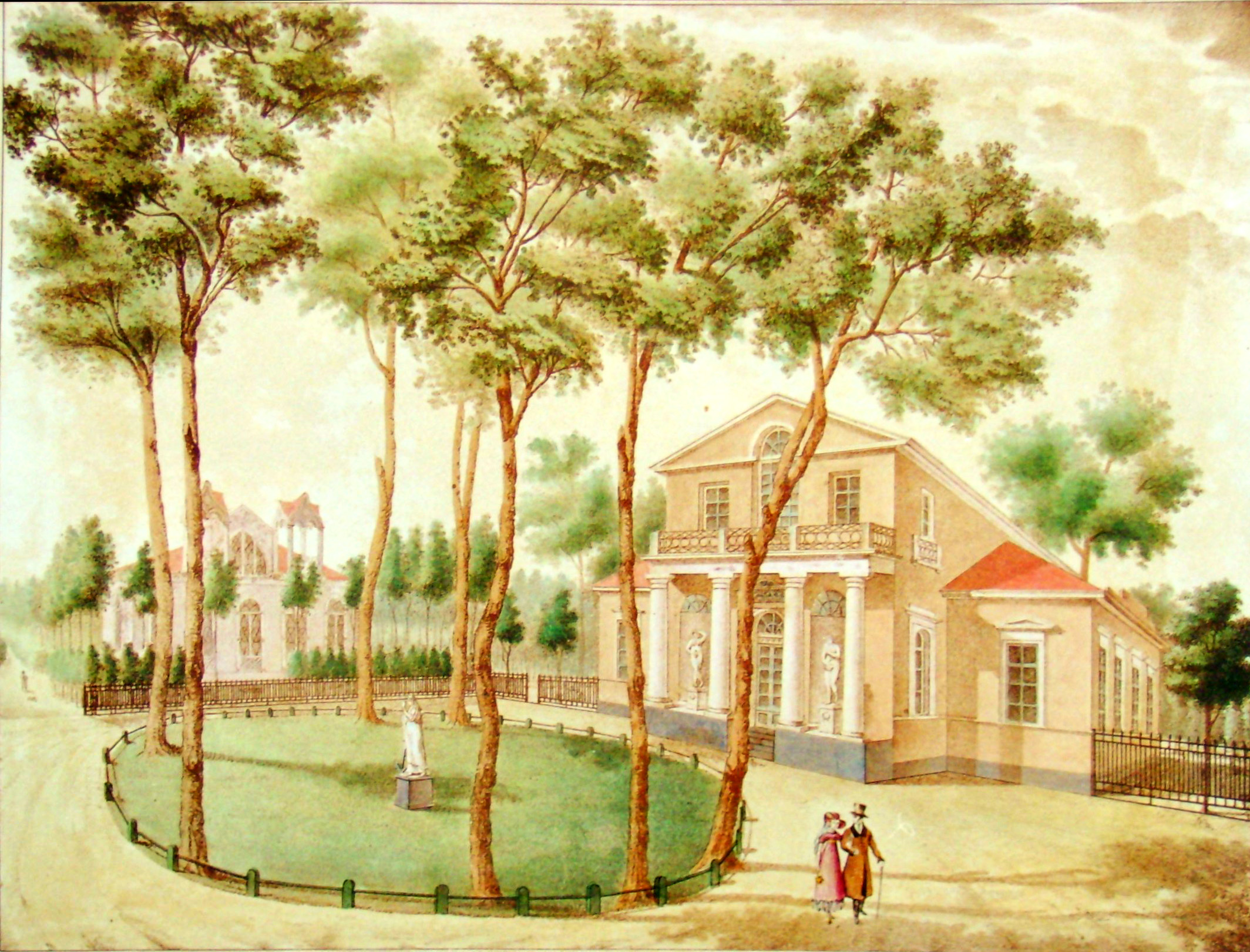 Усадьба была отстроена в сжатые сроки (1799–1814) по проекту архитектора Фёдора Демерцова. С 1815 года к ее обустройству был привлечен архитектор Василий Стасов. Планировка усадьбы во многом была обусловлена природой участка — холмом конической конфигурации. Парадным фасадом имение было развернуто к берегу Волхова. Сначала здесь появился летний дворец, затем шесть деревянных флигелей, в 1806-м — каменный Андреевский собор на месте старой деревянной церкви и каменный дворец, над балконом второго этажа которого была сделана надпись «Безъ лести преданъ». Вскоре на берегу Волхова появилась выстроенная Стасовым каменная пристань с двумя массивными башнями, увенчанными восьмиколонными ротондами. Они перекликались со зданием Андреевского собора, который был выдержан в строгих формах классицизма. Внутри стены храма были облицованы белым мрамором, на его фоне выделялись висевшие здесь знамена ополчений 1812 году и трофейные французские знамена. В соборе были установлены скульптура императора Павла I и памятник воинам, павшим в 1812–1814 годы.