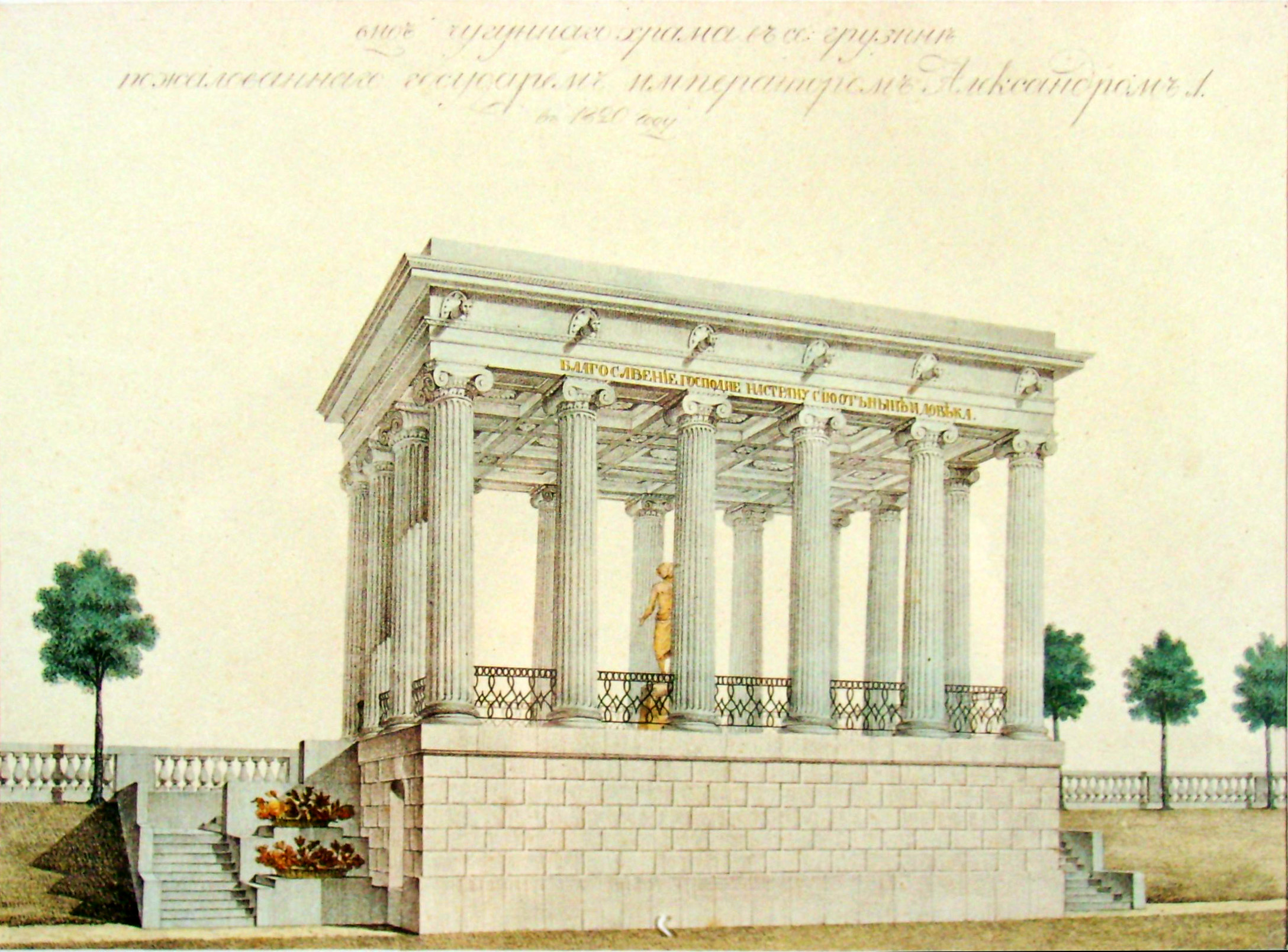 Вид чугунного храма в селе Грузине, пожалованного государем императором Александром I в 1820-м году