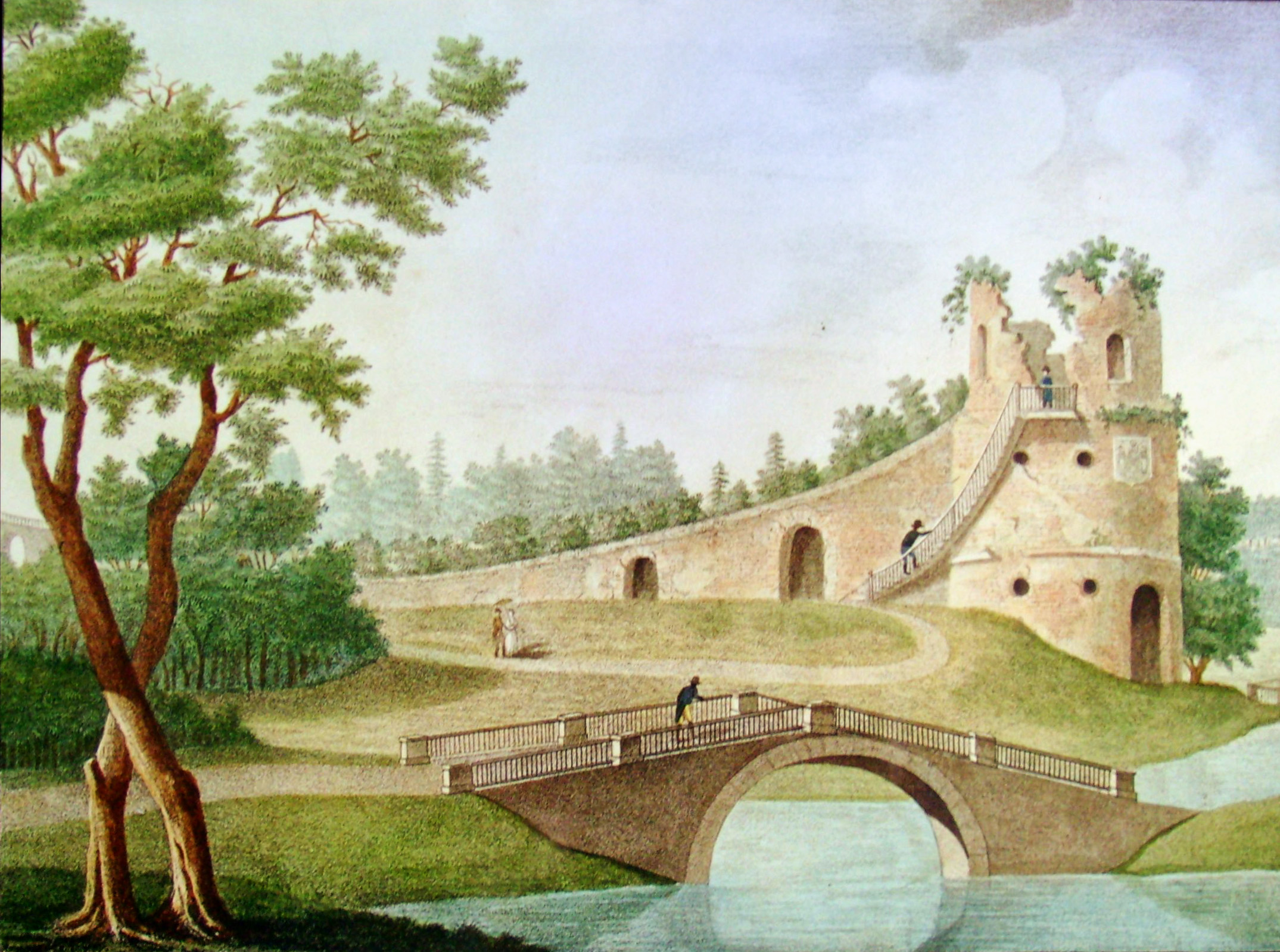 Окружавший усадебный дом пейзажный парк тоже был устроен с заботой и фантазией. По рисункам В.Стасова для парка создавались многочисленные чугунные решетки, балюстрады, скамейки, фонари, вазы и другие произведения малых форм. Аллеи парка украшали бронзовые фигуры, аллеи отделялись друг от друга воротами-арками на чугунных столбах. Из Волхова в парк были проведены каналы, устроена сложная система прудов с островками и каскадами. На одном из островков в память о первом русском генерале от артиллерии, начальнике Артиллерийского и Инженерного кадетских корпусов Петре Ивановиче Мелиссино был сооружен храм-павильон. Усадьба содержала и другие мемориальные объекты, связанные как с именами российских императоров, так и с жизнью самой усадьбы и ее владельцев. Например, грот «Руина» был создан в память об А.Меншикове.
