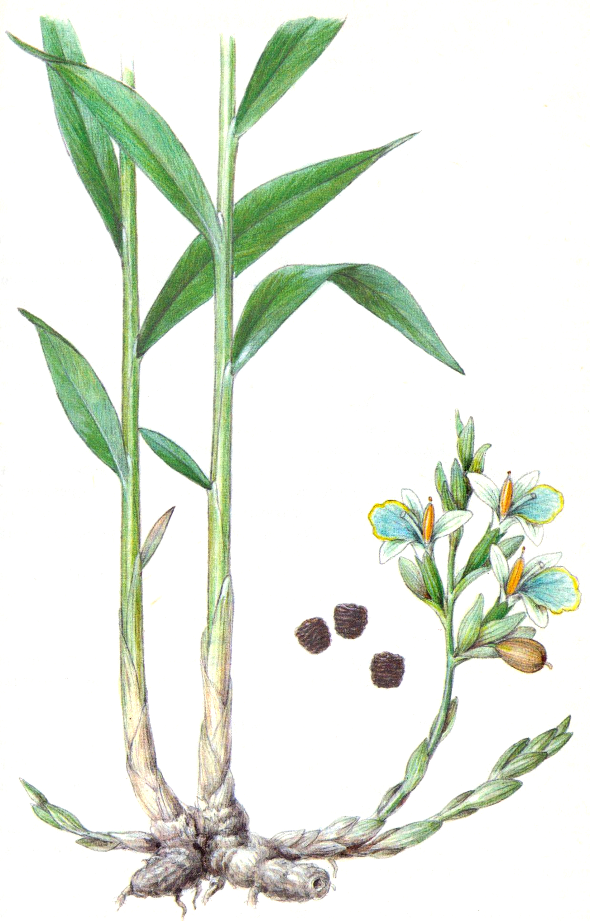 Кардамон. Ботаническая иллюстрация из книги А.Шедо «Пряности». Художник Индржих Крейча. 1983