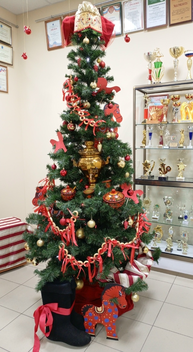 Новогодняя ёлка в русском народном стиле украсила холл Центра внешкольной работы г. Отрадное. Это не просто украшенное дерево, а образ, который строится на памяти, на традициях, на вещах, передающих тепло рук.
